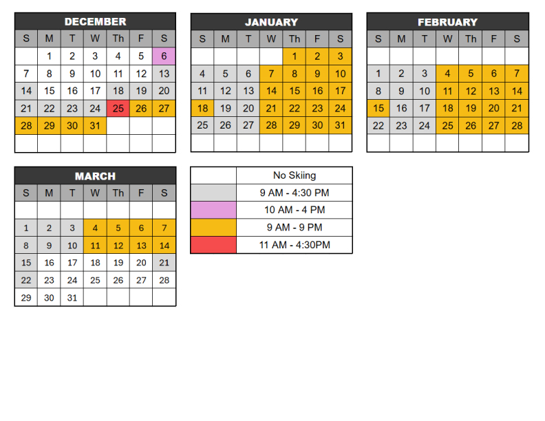 | Saturdays & Holidays (Beginning 12/26) | 9am-5pm | |