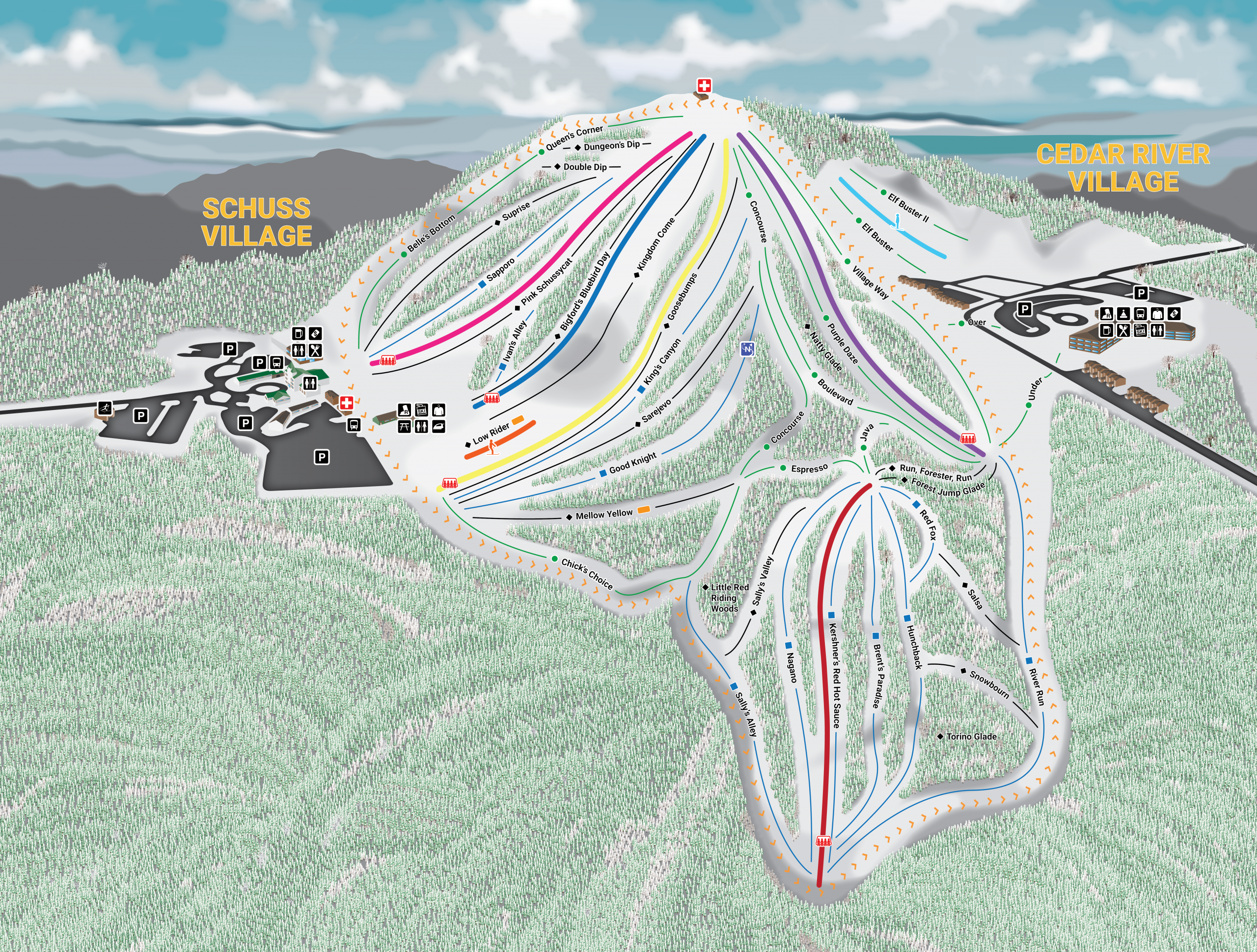 Mellow in name only, Schuss Mountain's terrain park on Mellow Yellow brings the heat: Big boxes, rails, booters, and bigger air.