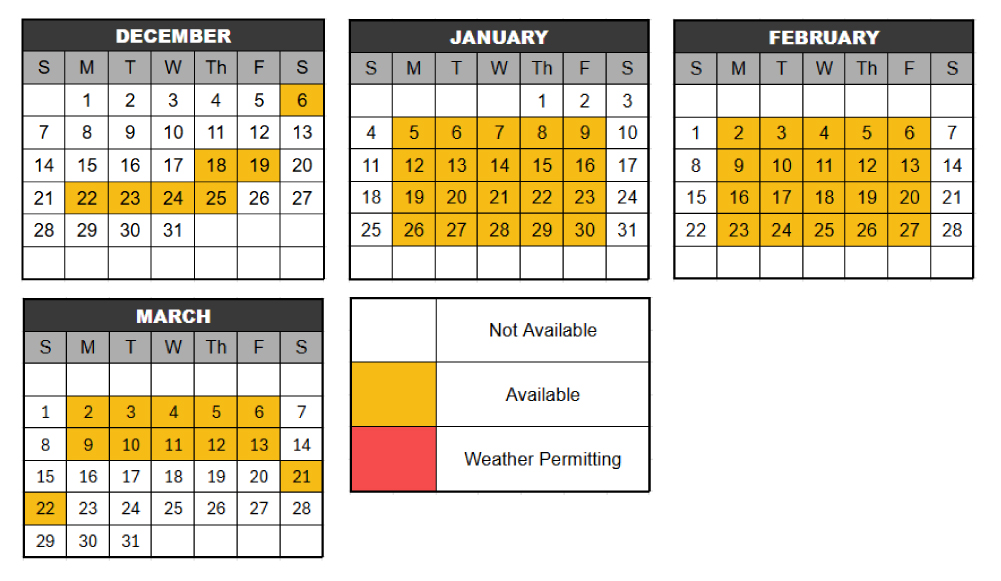 December 26, 2025-January 2, 2026; January 17-18 2026 ; February 14-15 2026